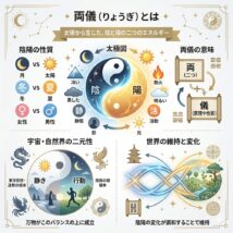 「男と女」「光と影」「動と静」。私たちの住む世界は、常に正反対の性質を持つ二つの要素がペアになって存在しています。この宇宙の根源的な二元性のことを、東洋思想では「両儀(りょうぎ)」と呼びます。 すべての始まりである「太極 […]