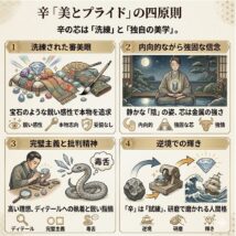 東洋占術のベースとなる十干(じっかん)の中で、最もエレガントで、かつ強靭な精神性を秘めているのが辛(しん)です。五行では「金」の「陰」に属し、イメージされるのは「磨き上げられた宝石」や「鋭利なカミソリ」。荒々しい鉄鉱石の […]