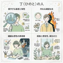 太陽(丙)がすべてを等しく照らす「公」の光なら、丁(ひのと/てい)は特定の場所を、特定の目的のために照らす「個」の光です。 四柱推命や算命学において、丁は「陰の火」を象徴します。それは暗闇の中で揺れるロウソクの炎であり、 […]