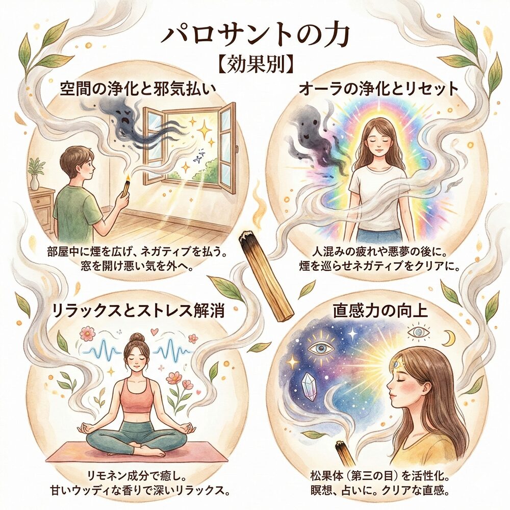 パロサントの最も知られている効果は、空間の浄化です。煙が部屋中に広がることで、ネガティブなエネルギーを払い、ポジティブな波動に変える力があります。