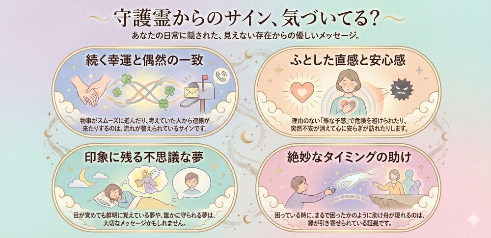 守護霊に守られてるサインは、特別な現象だけでなく、日常の中に静かに現れます。偶然の一致や直感、安心感や人との縁などは、すべて見えない存在からのメッセージかもしれません。大切なのは、サインを探しすぎることではなく、自分の感覚を信じて丁寧に生きることです。その姿勢こそが、守護霊とのつながりを自然に深め、人生の流れを穏やかに整えていく鍵となるでしょう。