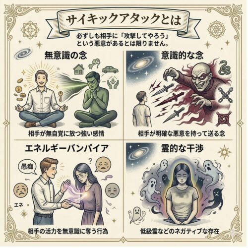 - サイキック能力: 霊的な存在だけでなく、未来の情報、感情、エネルギーのすべてを五感を超えて感知する能力の総称です。
