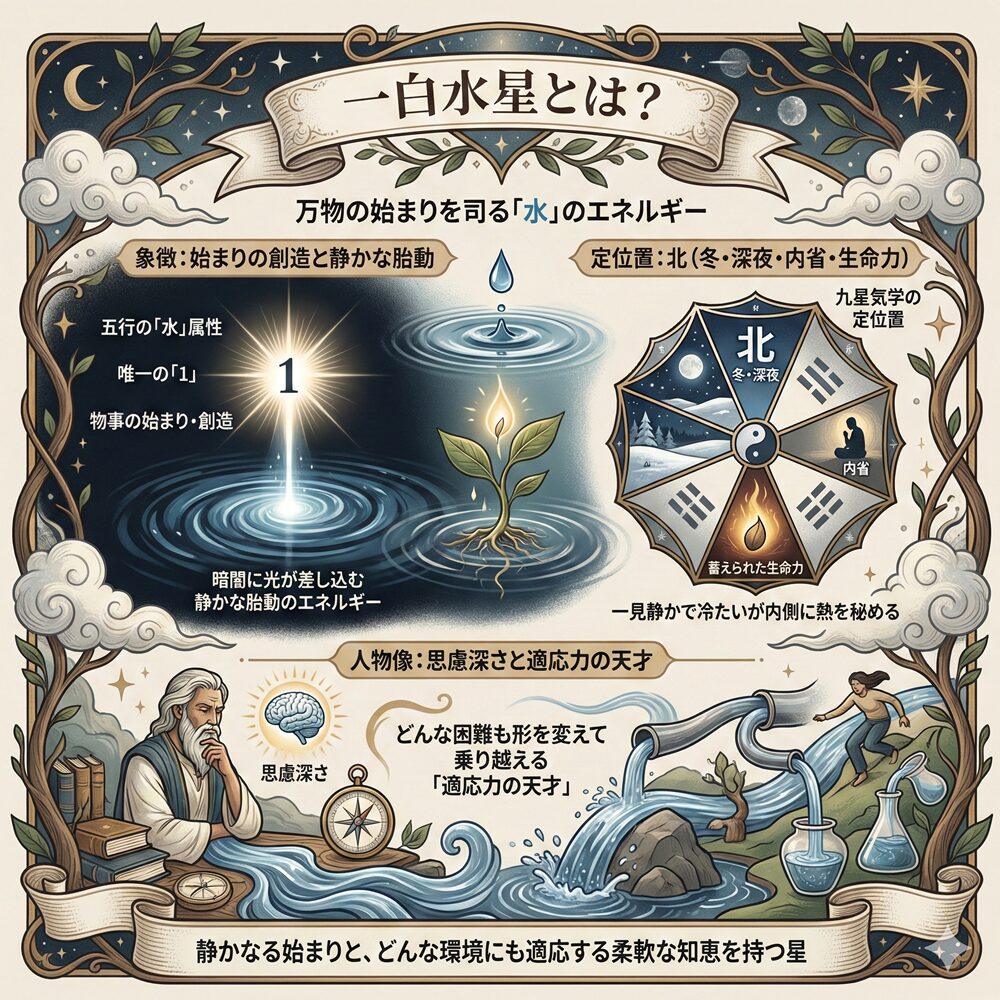 一白水星とは、生年月日から導き出される九星の一つで、五行の「水」の属性を持っています。九星の中で唯一「1」という数字を持つこの星は、物事の始まりや創造を意味し、暗闇の中に光が差し込むような、静かな胎動のエネルギーを象徴しています。