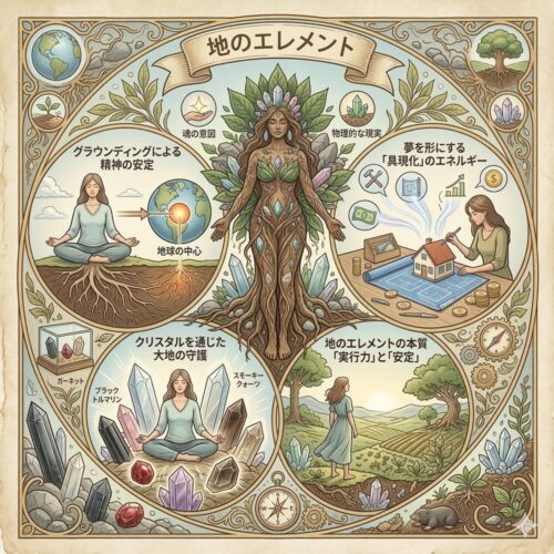 地のエレメントは、安定、成長、実現を象徴し、心を落ち着け、グラウンディングを促すために用いられます。大地のエネルギーとつながることで、心身の安定や、実際の成果を得るためのサポートが得られるとされています。