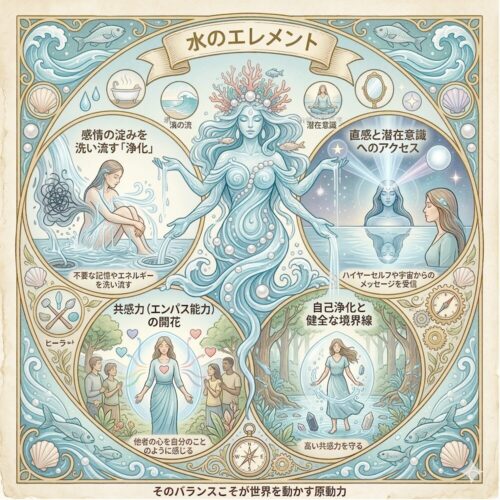 水のエレメントは、感情の浄化、ヒーリング、直感を象徴します。水は、感情の流れを整え、内面的な癒しや再生をもたらすとされ、スピリチュアルな実践においては、心の浄化やバランスを取るために用いられます。