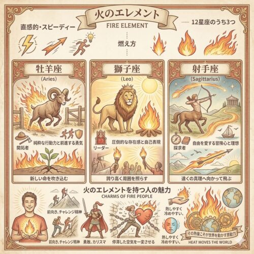 火のエレメントは、情熱、エネルギー、行動力を象徴します。火のエレメントに属する星座は、積極的で大胆な性格を持ち、リーダーシップや創造的な活動において力を発揮します。火のエレメントは、活力や冒険心、自己表現の強さが特徴です。