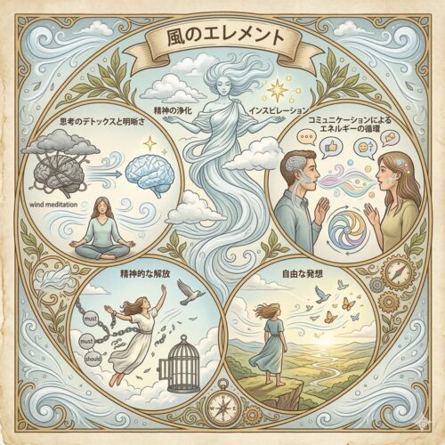 風のエレメントは、知識、インスピレーション、自由を象徴し、意識を高め、柔軟な思考を促進します。瞑想やリチュアルで風を意識することは、心を開放し、新たなアイデアや洞察を得るのに役立ちます。