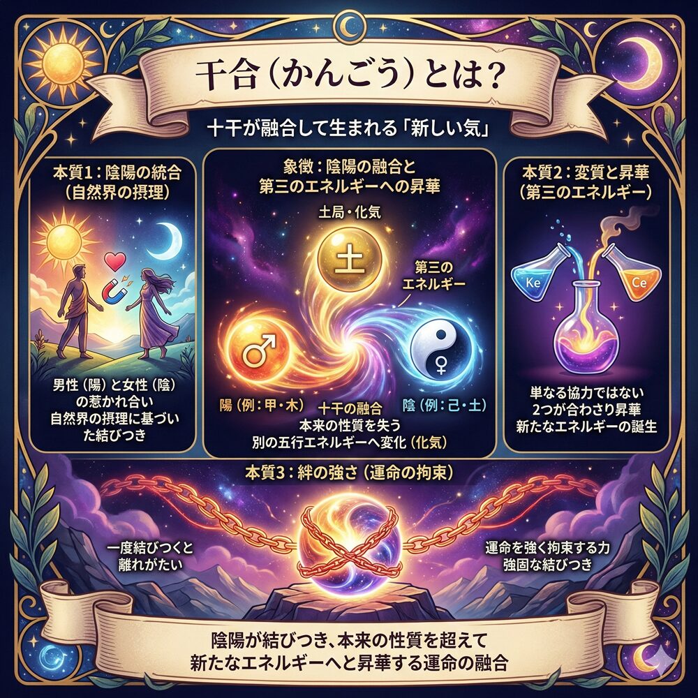干合(かんごう)は、私たちの命式に隠された「変身の魔法」のようなものです。異なるエネルギーが混ざり合い、新しい自分が誕生する。そのダイナミズムこそが、干合の最大の魅力です。