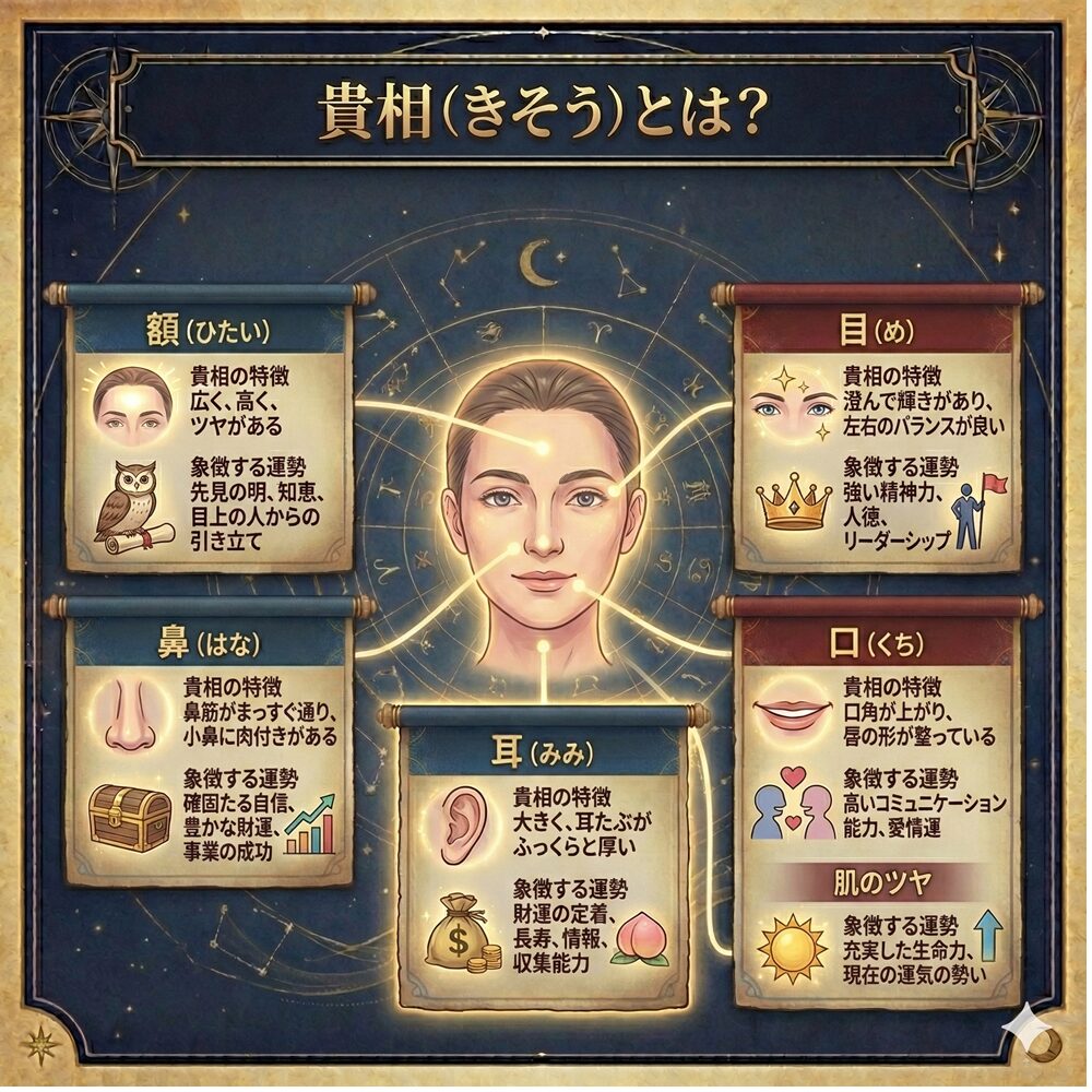 貴相(きそう)とは、相術において「高貴な身分」や「社会的な成功」「豊かな財運」を象徴する顔や体の特徴を指します。