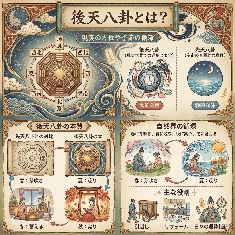 先天八卦が「宇宙の普遍的な真理(静的な体)」を表すのに対し、後天八卦は「現実世界での運用と変化(動的な用)」を表します。