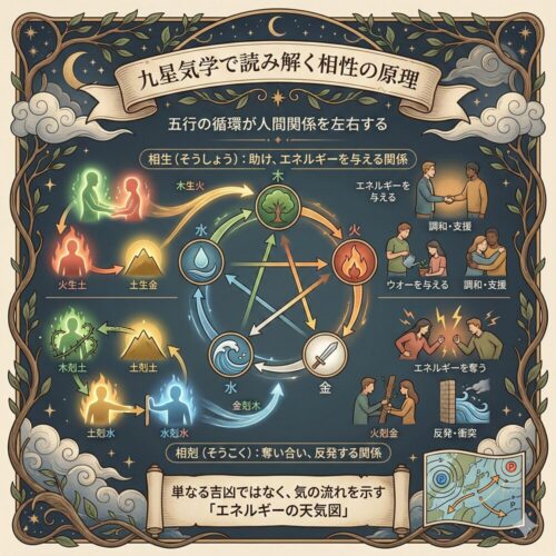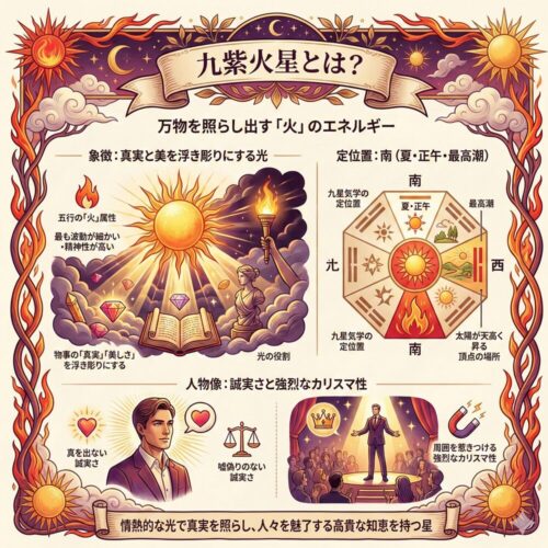 「火」は燃えて「土(灰)」となります。九紫火星の知性とひらめきが、五黄土星の実行力をさらに高め、正しい方向へと導いてくれます。