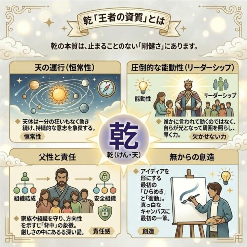 坤は、完全な陰のエネルギーを持っているため、物事を受け入れる力や柔軟性が強調されます。受動的であるものの、ただ受け身であるというわけではなく、周囲のエネルギーや状況を柔軟に受け入れ、対応する力を持っています。坤は、この受容的な性質によって、創造や発展を支える重要な存在となります。