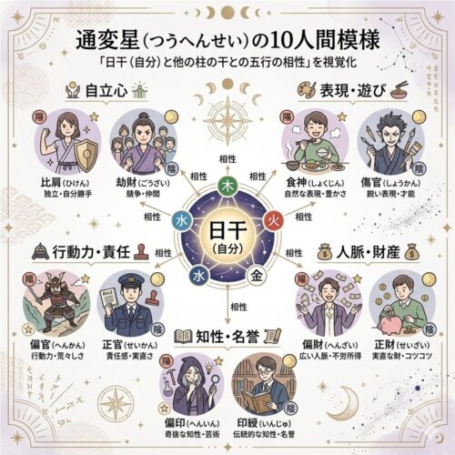 | 水 | 壬(みずのえ)・癸(みずのと) | 大海・雨露 | 知性、柔軟性、状況を察知する感性 |