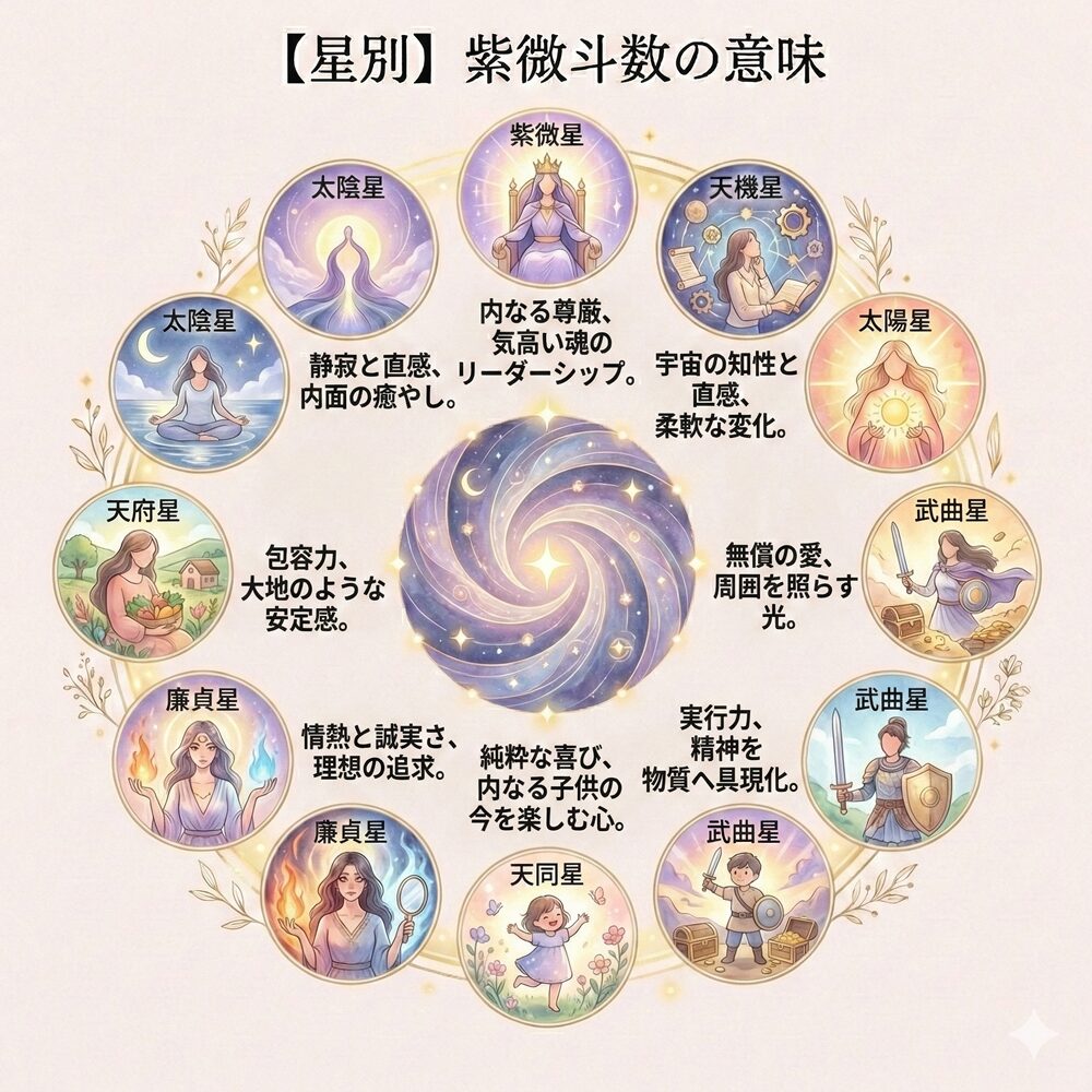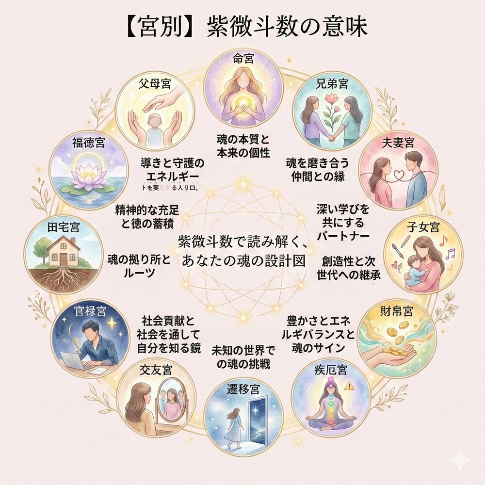 配置された星や宮の一つひとつには、前世からの繋がりや今世での課題、そして魂を輝かせるためのヒントが隠されているという捉え方です。 この記事では、紫微斗数に込められたメッセージを、各宮や星の役割別に20選にまとめて解説していきます。星々が示す魂の声に耳を傾けることで、自分自身の本質を理解し、運命を切り拓くためのヒントを見つけてみてください。