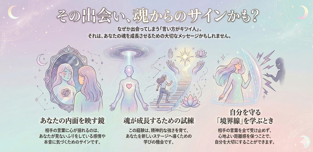 言い方がきつい人との出会いは、スピリチュアル的に見ると決して偶然ではなく、あなたの成長や内面的な気づきを促すために起こる出来事と考えられます。不快な言葉や態度に心が揺さぶられるときほど、そこには自分自身を見つめ直すヒントが隠れています。