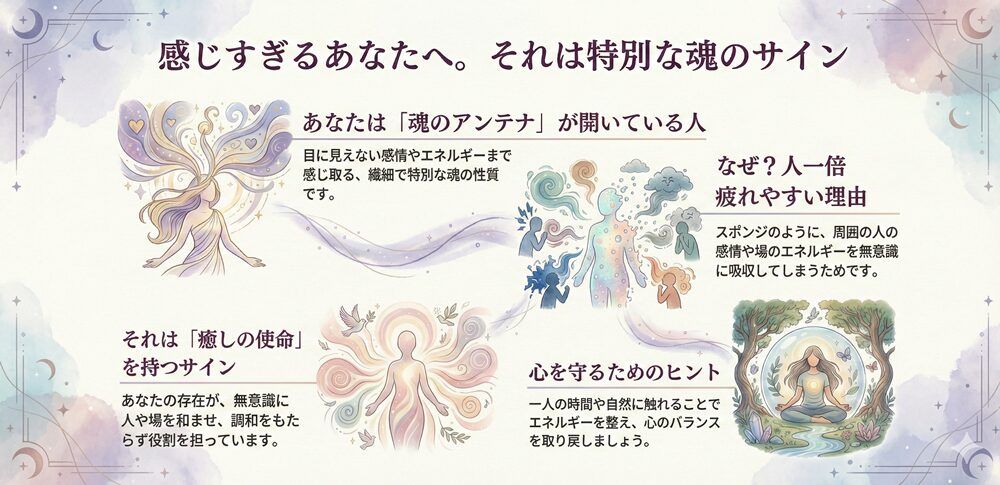 感受性が強い人は、スピリチュアルの視点で見ると、繊細で高度な魂の質を持つ存在です。人の感情や場の空気、言葉にならない違和感まで感じ取れるのは、魂のアンテナが広く開いている証であり、決して弱さではありません。むしろ、その感受性の強さは、他者に寄り添い、調和をもたらすための大切な資質だといえます。