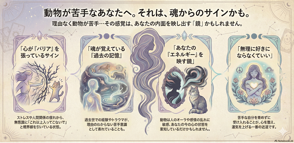 すべての人が動物と親和性を持つ必要はなく、無理に合わせることでエネルギーが乱れる場合もあります。苦手であること自体が悪いわけではなく、自分の特性を知るためのヒントです。距離を取りつつ、他の分野で優しさや共感を発揮することも、十分な学びといえるでしょう。