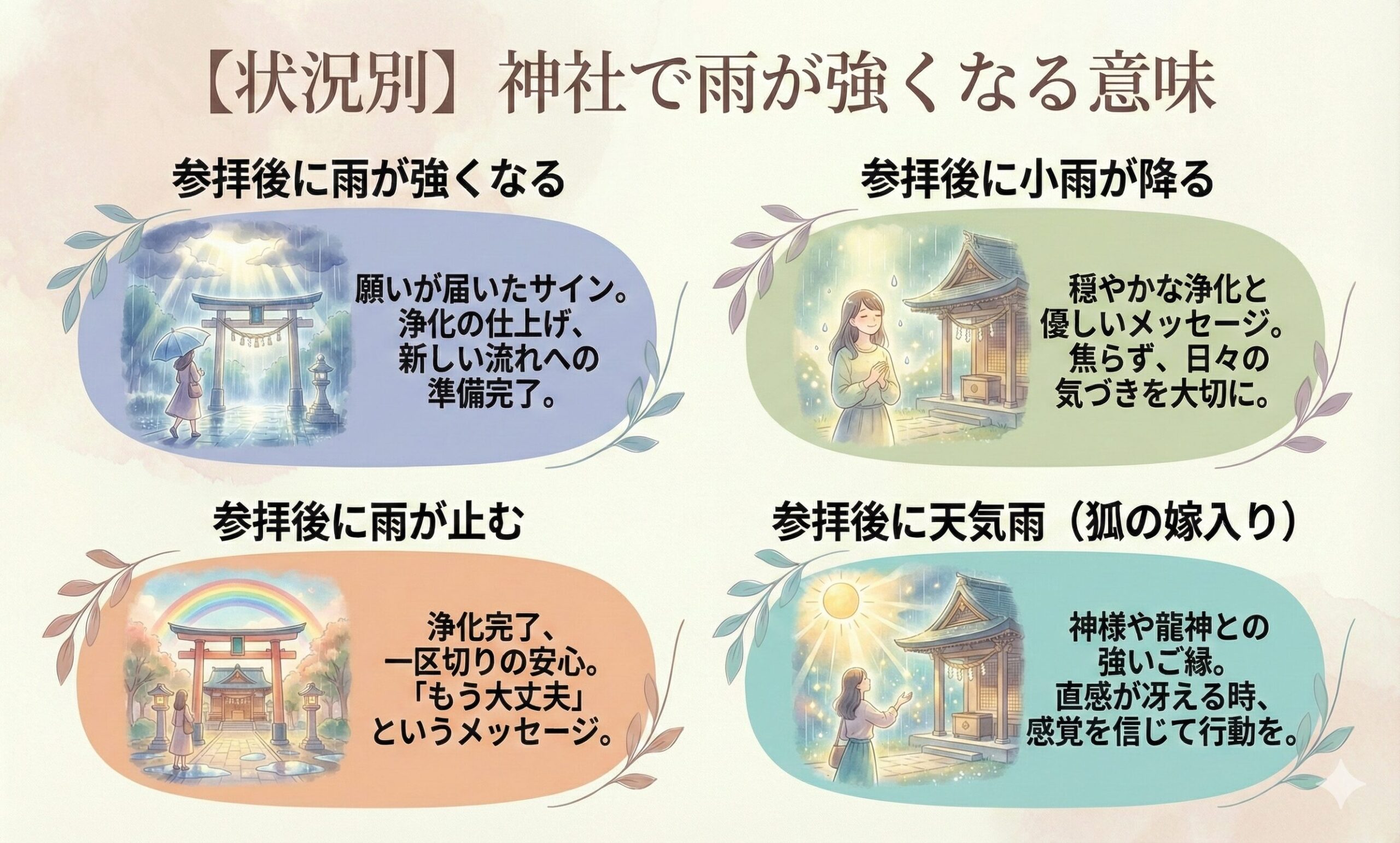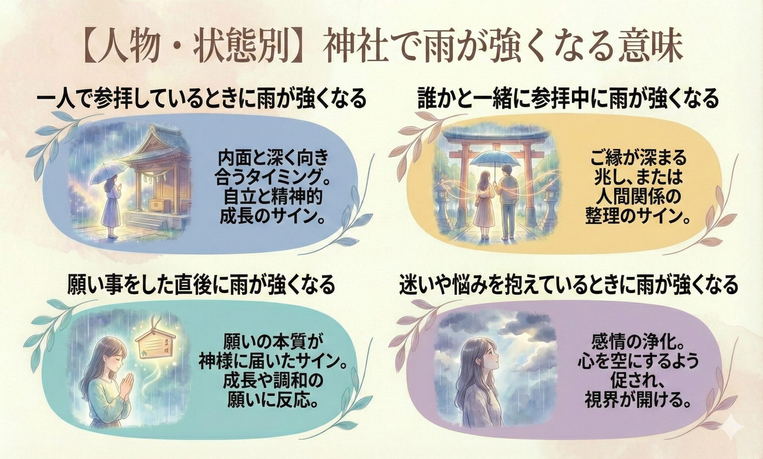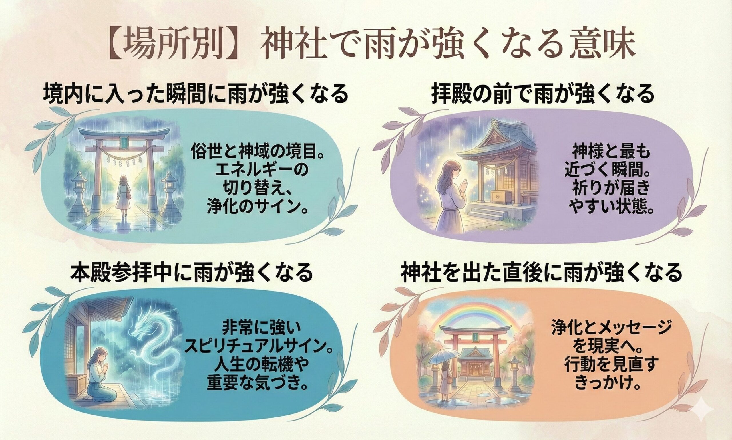 この記事では、神社で雨が強くなるスピリチュアルな意味を、状況・場所・人物・天候・夢など多角的な視点から詳しく解説していきます。