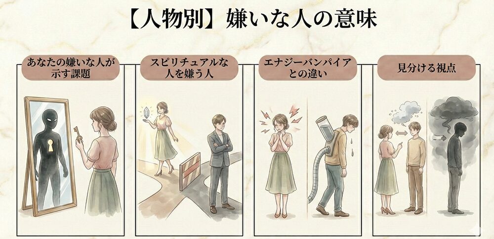 スピリチュアルの視点では、こうした感情は単なる相性の問題ではなく、魂の成長やエネルギーの変化を知らせるサインとして捉えられることがあります。嫌いな人の存在には、今の自分に必要な気づきや課題が隠されていることも少なくありません。