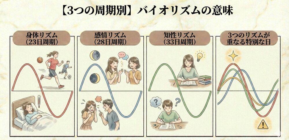 運勢のバイオリズムとは、生年月日を起点として周期的に変動する心身のリズムのことです。身体(23日周期)、感情(28日周期)、知性(33日周期)の3つの波があり、それぞれが私たちの日々の調子に影響を与えています。