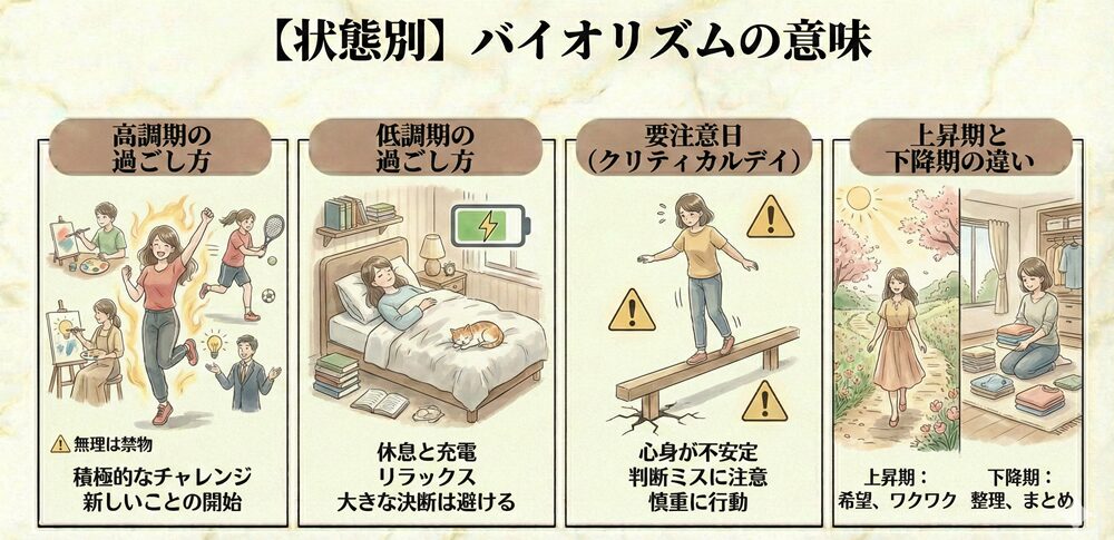 高調期には気持ちが前向きになり、人間関係もスムーズに進みやすい時期です。低調期にはイライラしやすく、些細なことで落ち込みやすくなるため、大切な話し合いは避けたほうが無難かもしれません。