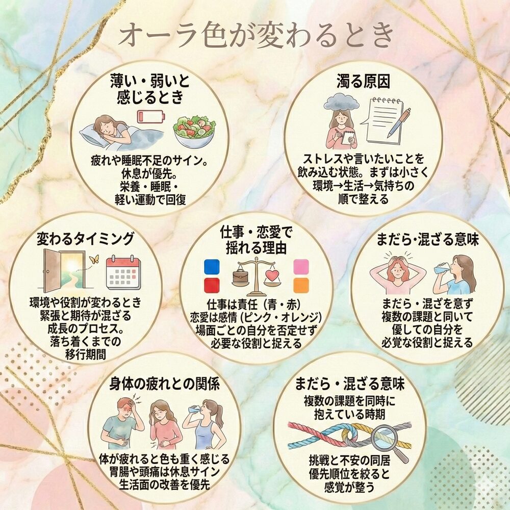 オーラ色は一生同じではなく、生活や人間関係の影響で変わると考えられています。転職や引っ越し、恋愛などの節目で色が変わったように感じる人もいます。だからこそ、結果に縛られず「今の状態」を見直す材料にするのがコツです。変化は悪いサインではなく、調整のチャンスとして受け取れます。