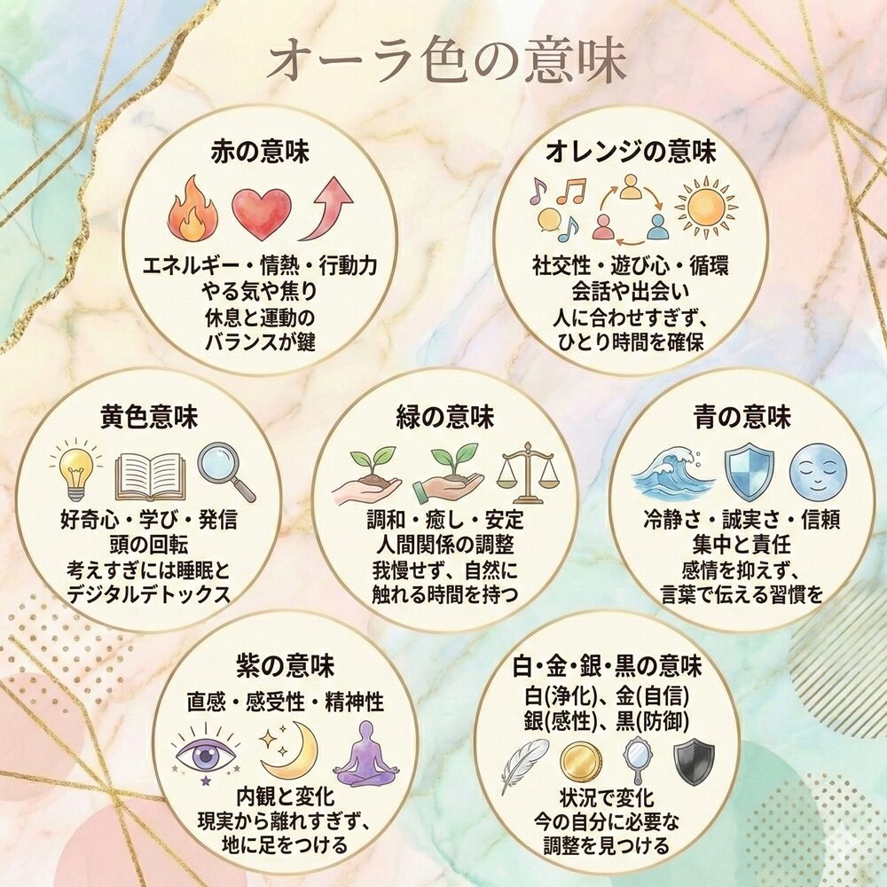 オーラ色は、心の状態やエネルギーの強さを色で表現したものとされます。元気なときは明るく、疲れているときは重く感じる、というイメージです。運気の良し悪しを断定するものではなく、今の自分を客観視する鏡として役立ちます。まずは「当たる・当たらない」より、気づきがあるかを大事にしましょう。