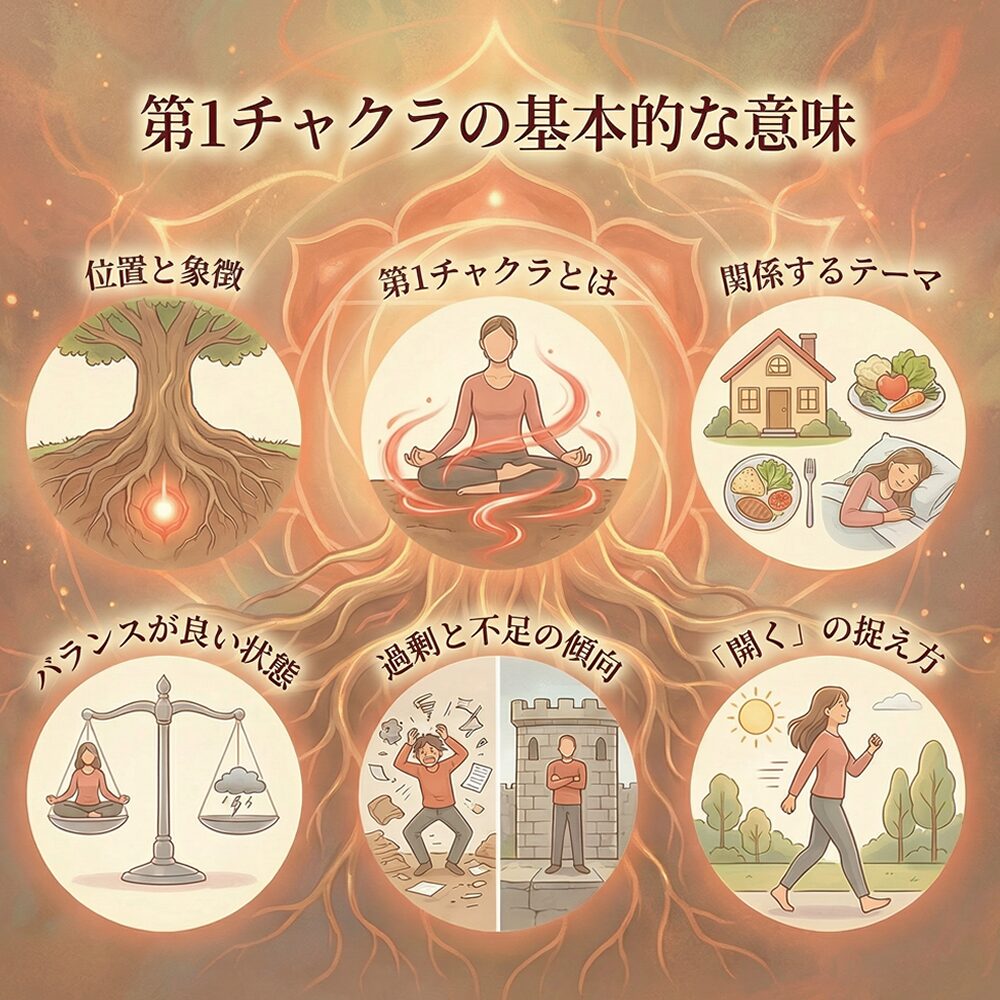 第1チャクラは「土台」「生存」「安心」と結びつけて語られることが多いチャクラです。ここが整うと、気持ちが落ち着き、現実の判断がぶれにくくなると言われます。“開く”は派手な感覚が出るというより、日常が安定していく方向の変化として現れやすいです。スピリチュアルとして扱いつつ、生活の整い具合として見ると実用的です。