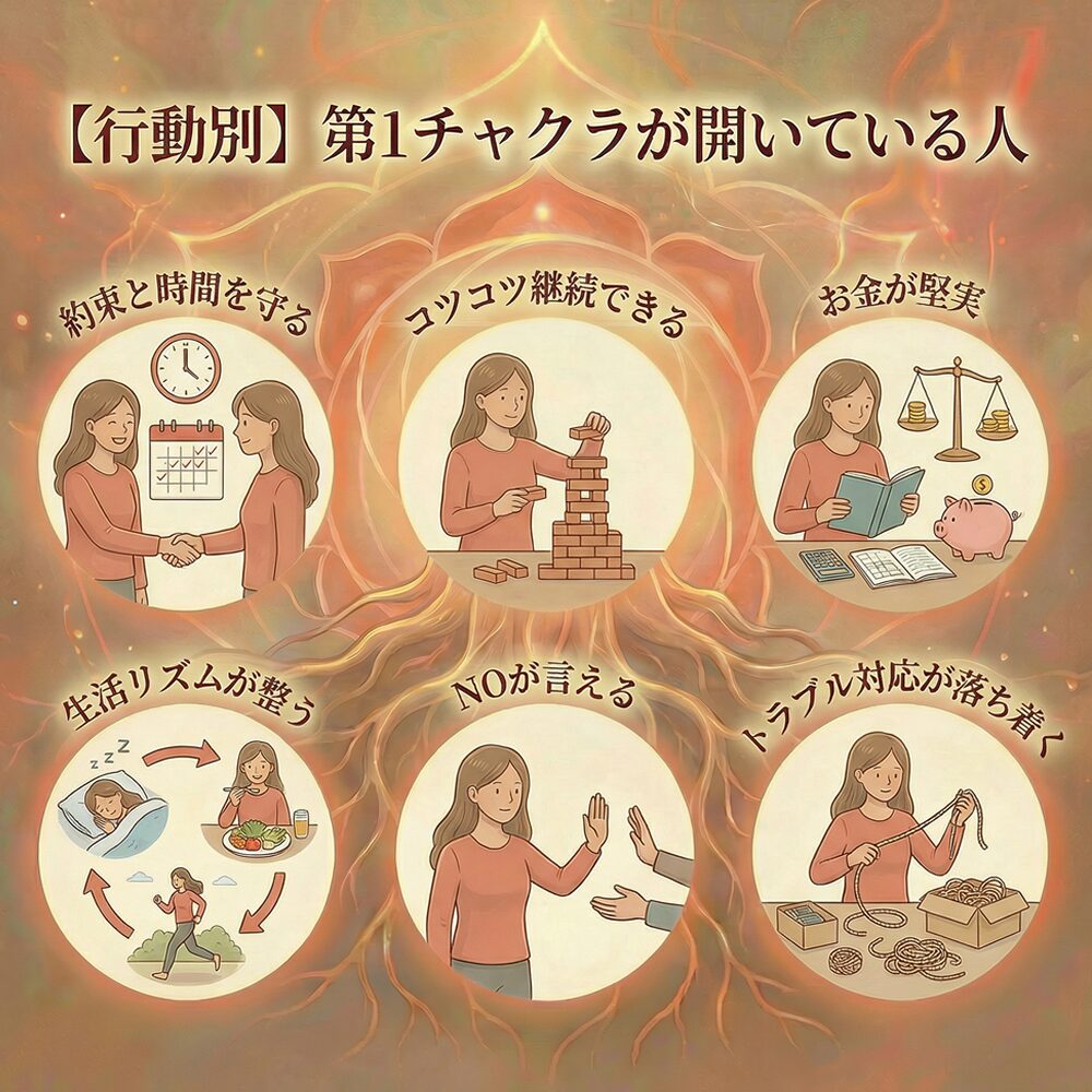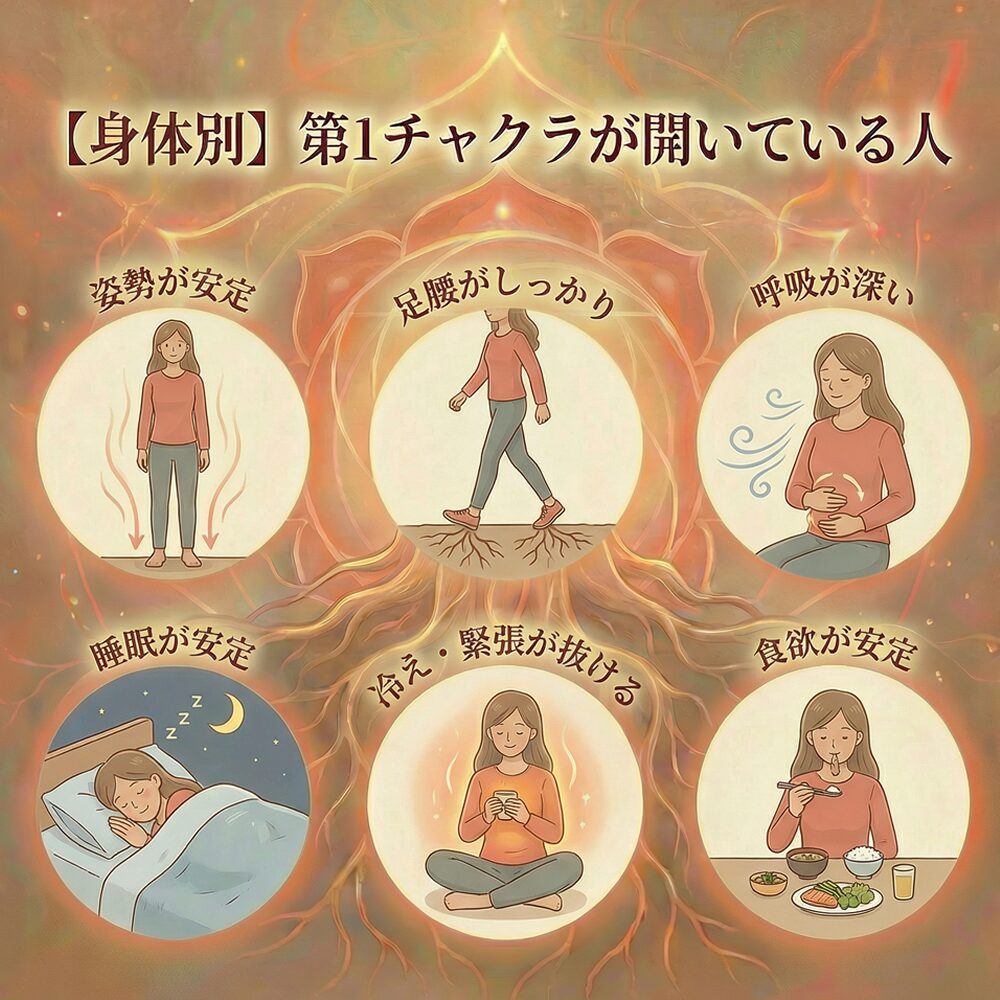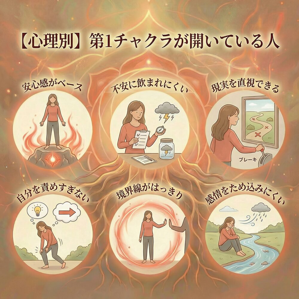 第1チャクラが開いている人は、安心感を土台にして現実を落ち着いて扱える傾向があります。心では不安に飲まれにくく、行動では継続や堅実さが出やすく、体では姿勢や呼吸の安定として表れやすいです。土台が揺れると焦りや現実逃避が増えるので、まずは足裏・睡眠・温める習慣で整えるのが近道です。派手なサインより、日常が安定していく方向を目安にしてみてください。