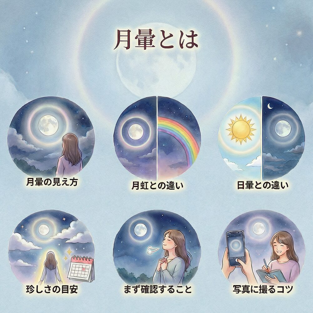 月暈と月虹は似て見えますが、月虹は“虹”として弧が出るイメージに近いです。月暈は月の周囲にリング状の輪が出るのが特徴です。どちらも珍しく、見たときの驚きが特別感につながります。呼び名に迷ったら、まず「輪か弧か」で分けると分かりやすいです。