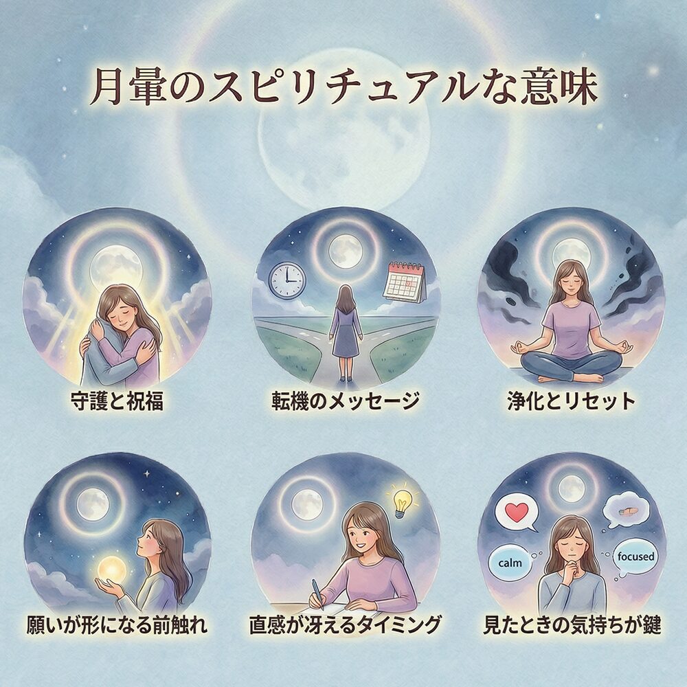 月のまわりに光の輪が出る「月暈」を見て、なんだか意味がありそう…と感じた人へ。スピリチュアルでは月暈は、浄化・守護・転機のサインとして語られることがあります。ただし月暈は自然現象でもあるので、怖がる必要はありません。見た瞬間の気持ちをヒントに、現実の行動を少し整えると、体験がちゃんと自分の力になります。