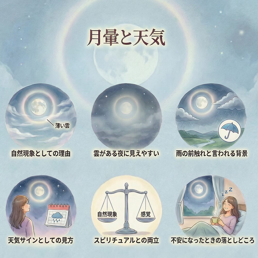 月暈は、空の状態によって起こる自然現象です。薄い雲が広がっているときに見えやすいと言われます。つまり「スピリチュアルか科学か」ではなく、どちらも成立します。現象は自然、受け取り方は自分、という考え方が一番ラクです。