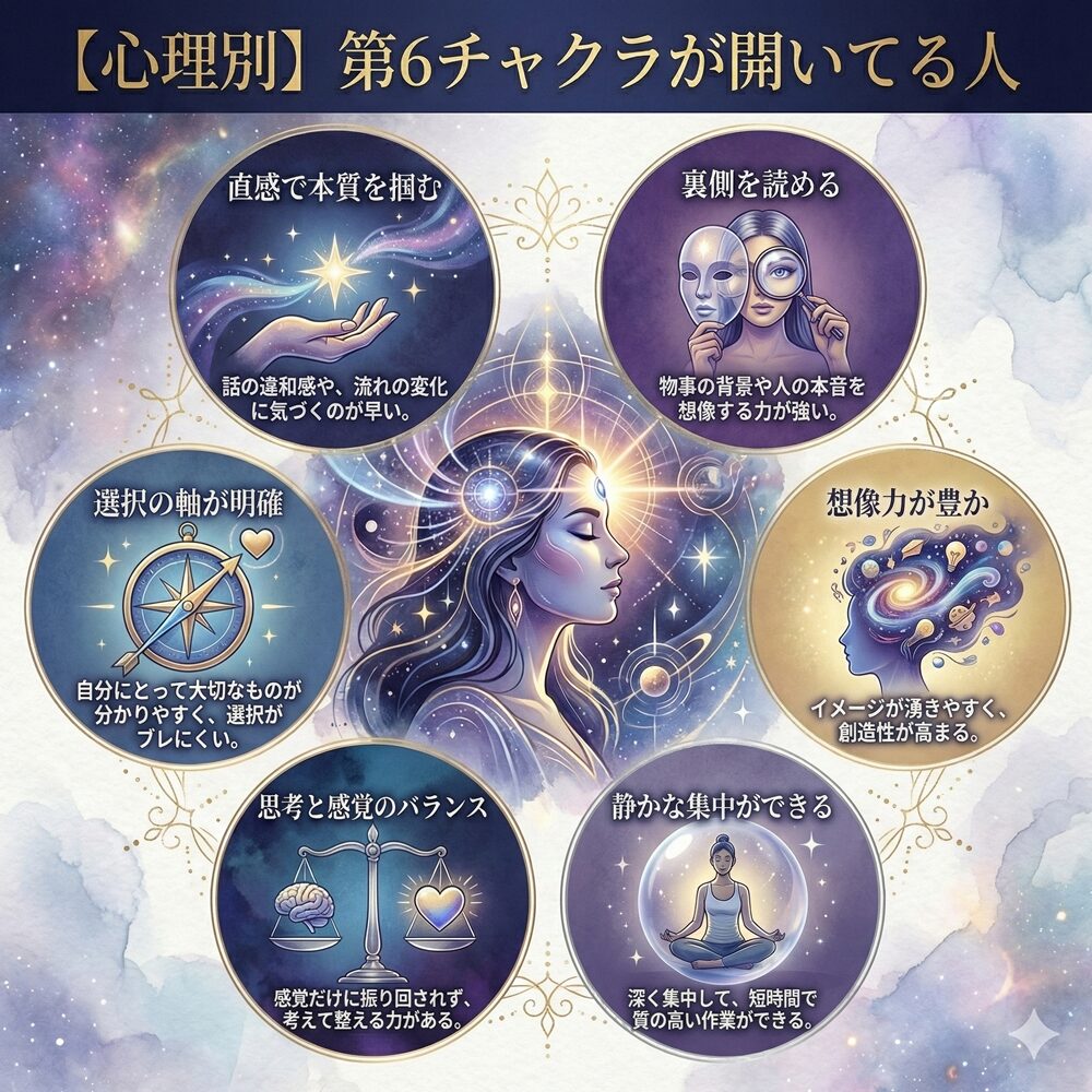 第6チャクラが開いてる人は、直感や洞察が冴え、物事の本質をつかみやすいと言われます。心では視点の広さ、行動では決断の早さや情報整理、体感では眉間の感覚やひらめきとして表れやすいです。一方で過剰になると考えすぎや不安、眠れなさにつながることがあります。整えるコツは、目を休めて情報を減らし、静けさと散歩でバランスを取ること。落ち着く方向を目安にしてみてください。