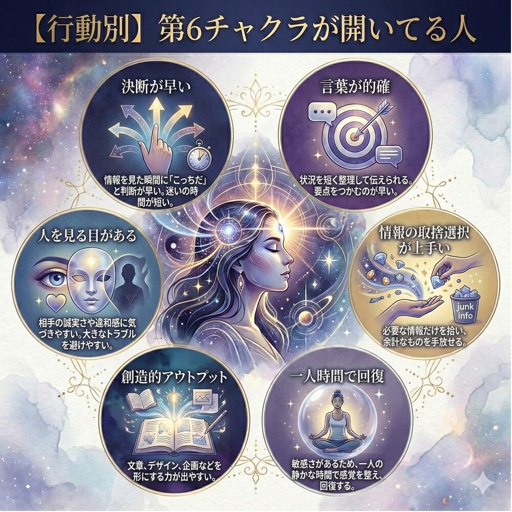 第6チャクラが開いている人は、情報を見たときに「これは違う」「こっちだ」と判断が早いと言われます。迷いがゼロではなく、迷いの時間が短いのが特徴です。決めた後に必要な調整ができるので、結果的に前に進みやすいです。決断の早さは、普段の整いから生まれます。