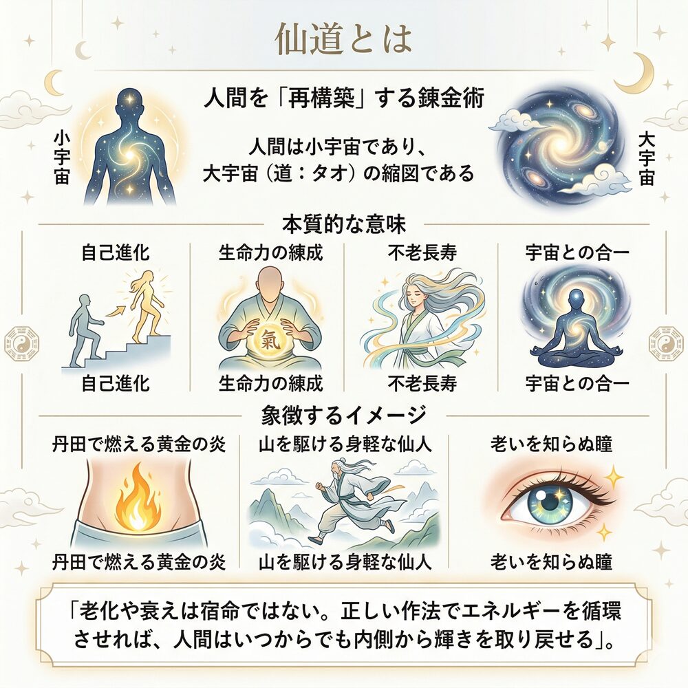 老いやストレスに負けるのが当たり前の世界で、自らの心身を磨き上げ、宇宙と共鳴しようとする意志。その挑戦的な生き方こそが、あなたを「仙人」のような自由で軽やかな境地へと連れて行ってくれます。