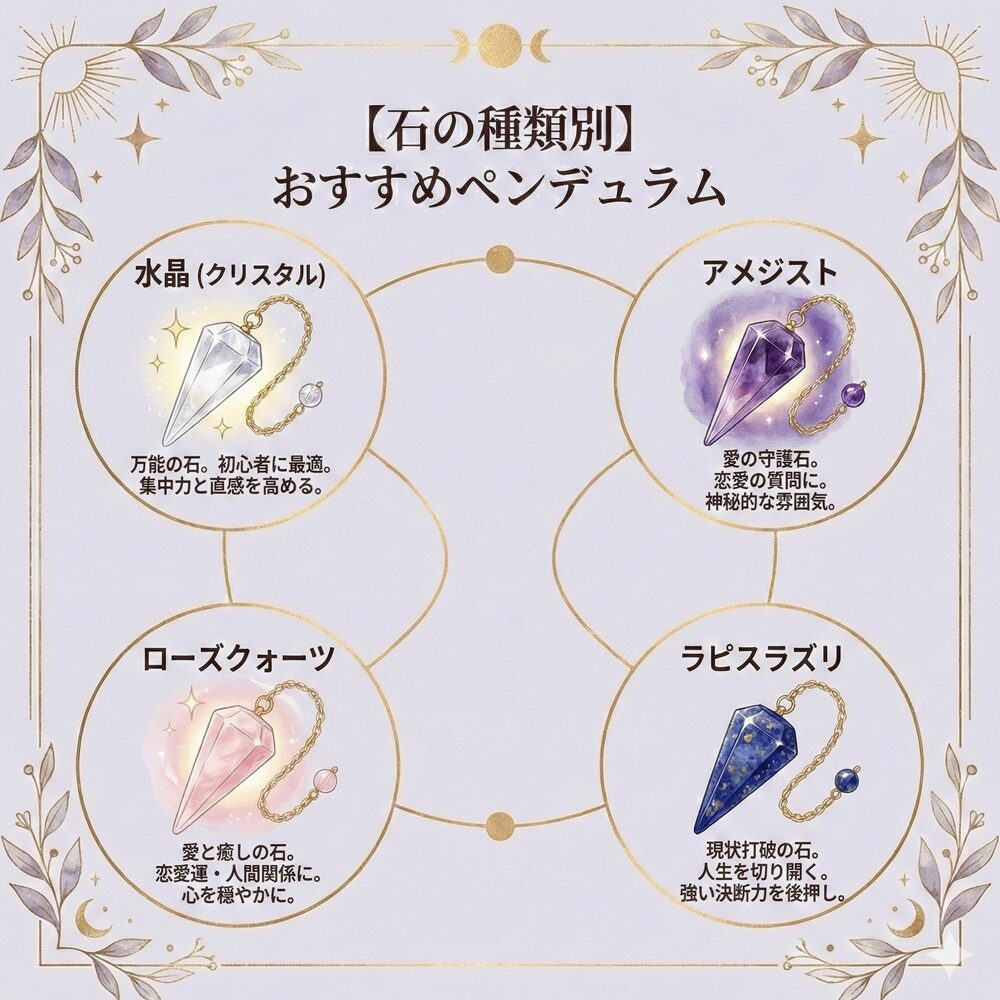 石の種類によって持つエネルギーが異なり、万能な水晶、恋愛向きのローズクォーツやアメジスト、決断力を高めるラピスラズリなど様々な選択肢があります。選ぶ際は直感を大切にし、自分が心地よいと感じるものを選びましょう。使用前後の浄化と感謝の気持ちを忘れずに、ペンデュラムとの対話を楽しんでみてください。