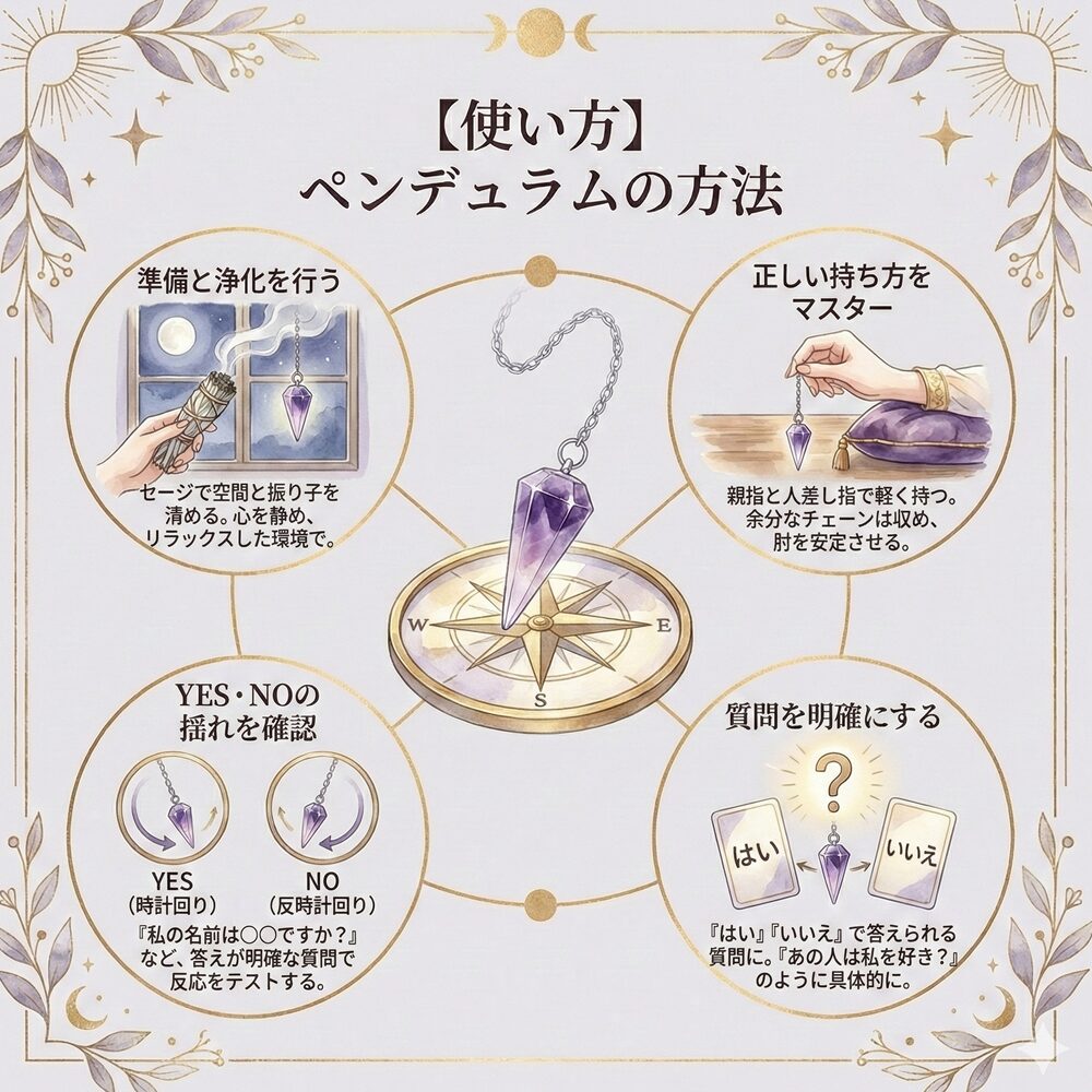 ペンデュラムを使うことで、心の奥にある答えを引き出し、運命を切り開く力を得ることができます。使い方は、まず浄化を行い、リラックスした状態で「YES」「NO」の質問を投げかけるだけ。シンプルながらも深い洞察を得られるのが魅力です。