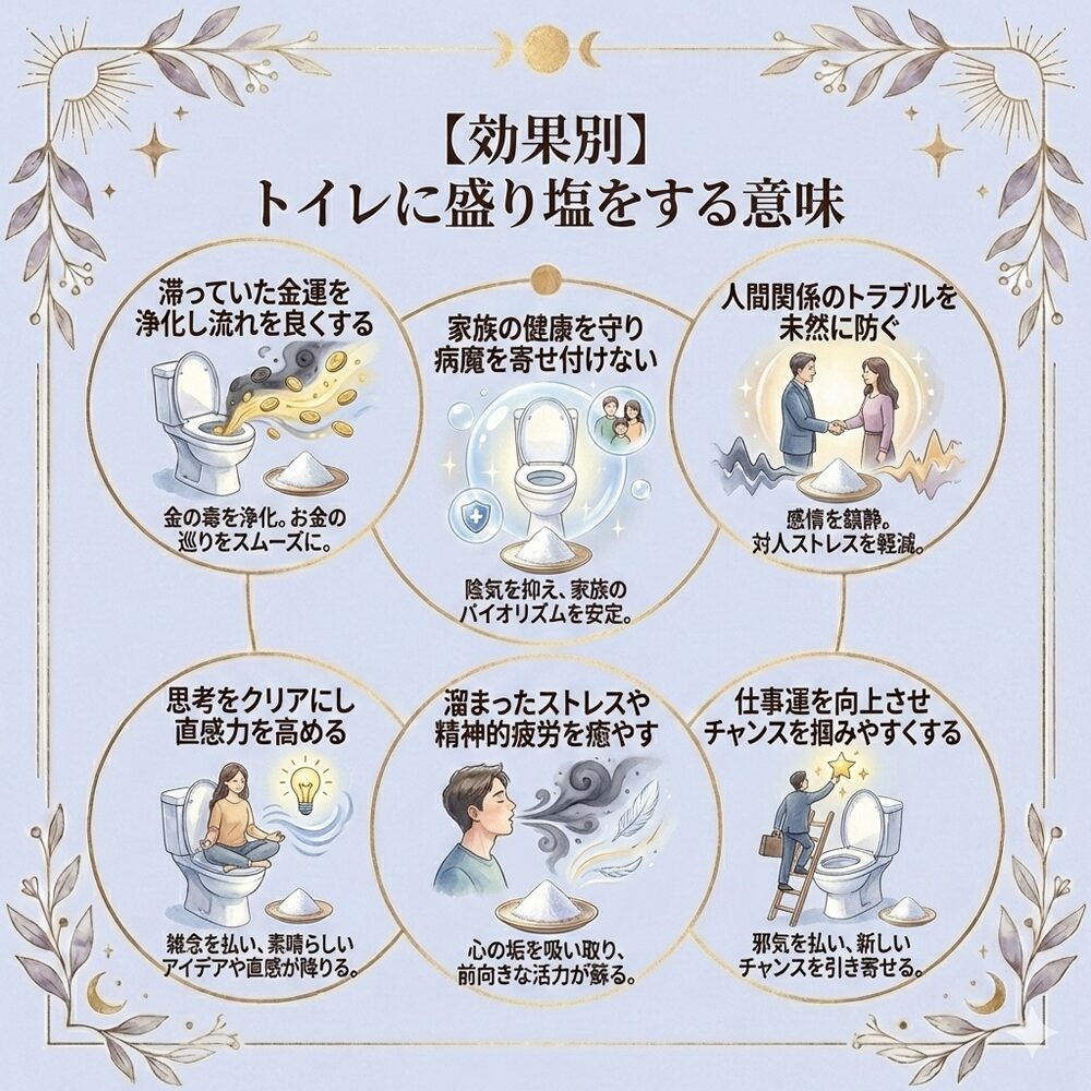 風水において、トイレの乱れは消化器系や婦人科系の健康に直結すると言われています。盛り塩によって空間の陰気を抑えることは、家族のバイオリズムを安定させ、病の種を寄せ付けない体作りをサポートするスピリチュアルな防御策となります。清浄な空気の中で用を足す習慣が、心身の健やかさを内側から支えてくれます。