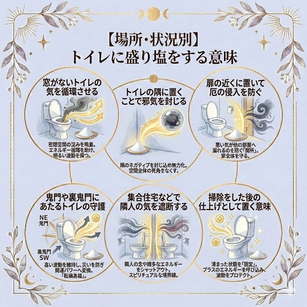 トイレは風水やスピリチュアルにおいて「厄が溜まりやすい場所」とされる一方で、整え方次第で「金運や健康運を呼び込む源」にもなります。その浄化方法として古くから親しまれているのが「盛り塩」です。しかし、なぜトイレに塩を置くことが運気の好転に繋がるのか、その深い理由まで知っている方は少ないかもしれません。