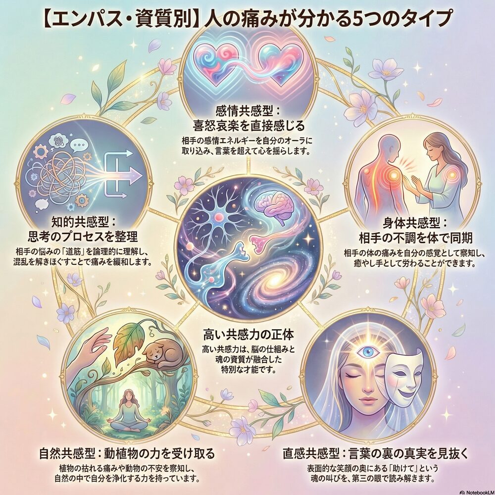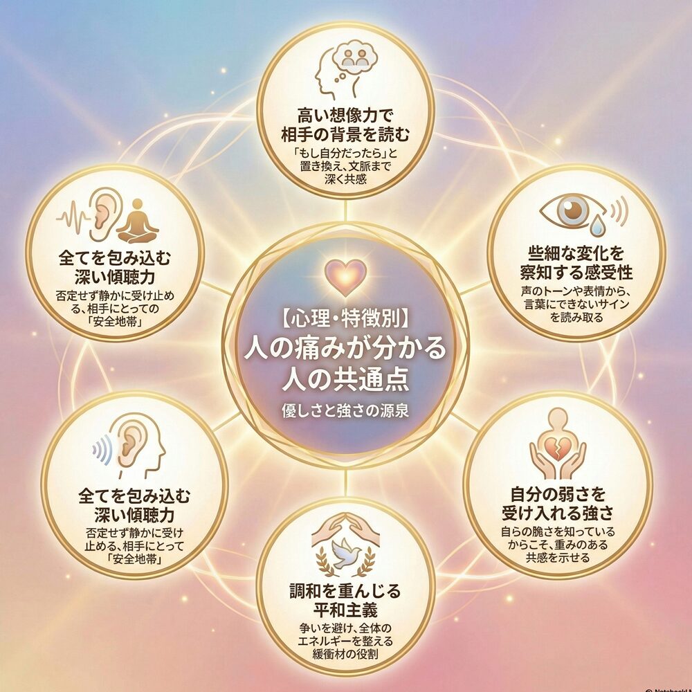 相手が何に悩み、なぜそのような結論に至ったのかという「思考の道筋」を鮮明に共有できる能力です。論理的な背景を含めて痛みを理解できるため、感情論だけでなく、実質的な解決策や納得感のある寄り添い方ができます。相手の頭の中にある「混乱」を整理してあげることで、精神的な痛みを緩和させるという、知的な癒やしの役割を担っています。