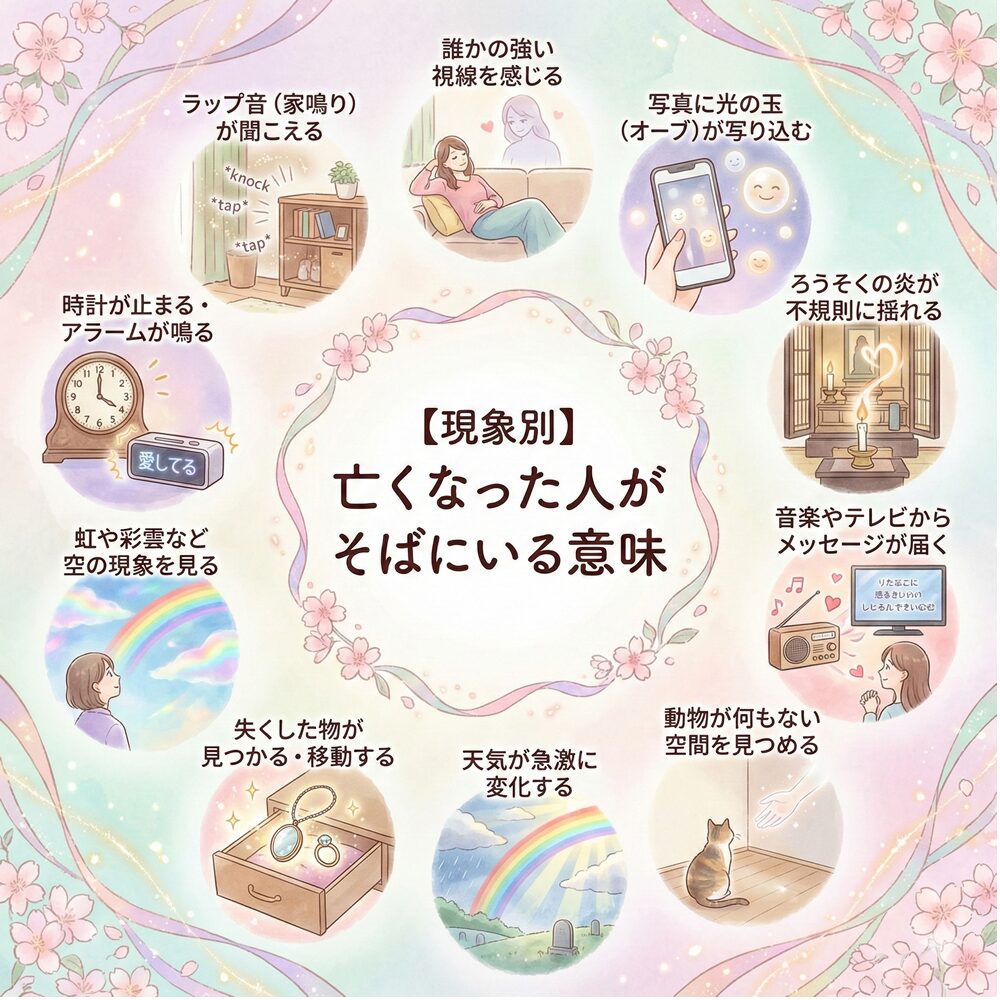 大切な人を亡くした喪失感は、言葉では言い表せないほど深いものです。しかし、ふとした瞬間に「あ、今ここにいるかもしれない」と感じることはありませんか?それは決して気のせいではなく、亡くなった人があなたのそばにいるサインかもしれません。彼らは肉体を離れても、魂としてあなたを見守り続けています。この記事では、亡くなった人がそばにいる時のサインを、状況や現象別に詳しく解説します。メッセージを受け取り、心を癒すヒントにしてください。