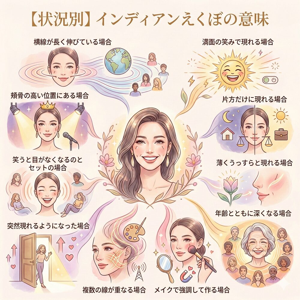 今までなかったのに、ある時期から急にインディアンえくぼが出るようになった場合、それは運気の変わり目、特に「モテ期」や「人気運の上昇」のサインです。魂のレベルが変化し、より開放的で明るい波動になったことを示しています。新しい出会いやチャンスが次々と舞い込む時期ですので、家に閉じこもらず積極的に外に出て、その波に乗ることが重要です。
