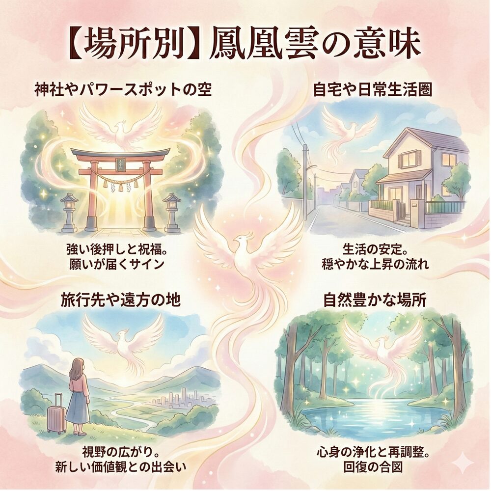 神社やパワースポットの上空に鳳凰雲を見た場合、それは強い後押しや祝福の意味を持つサインと考えられます。もともと神聖なエネルギーが集まりやすい場所に、鳳凰という吉兆の象徴が重なることで、「今の願いや祈りが正しい方向へ届いている」というメッセージ性がより強まります。