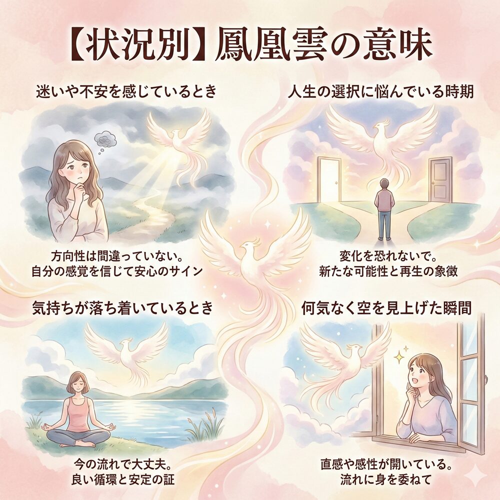不安を伴う変化であっても、鳳凰雲は「その変化はあなたをより良い方向へ導く」という後押しの意味を含んでいます。変化を恐れるより、流れに身を委ねる姿勢が大切な時期です。