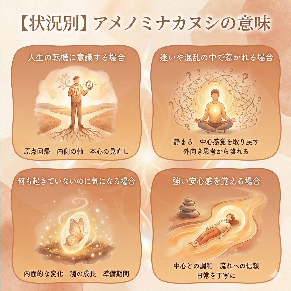 転職、引っ越し、人間関係の変化など、人生の大きな節目にアメノミナカヌシが気になる場合、それは「原点に立ち返るタイミング」を示しています。環境をどう変えるか、どの選択肢が有利かといった表面的な判断よりも、「なぜそれを選ぶのか」「自分は何を大切にして生きたいのか」という内側の軸が問われている状態です。