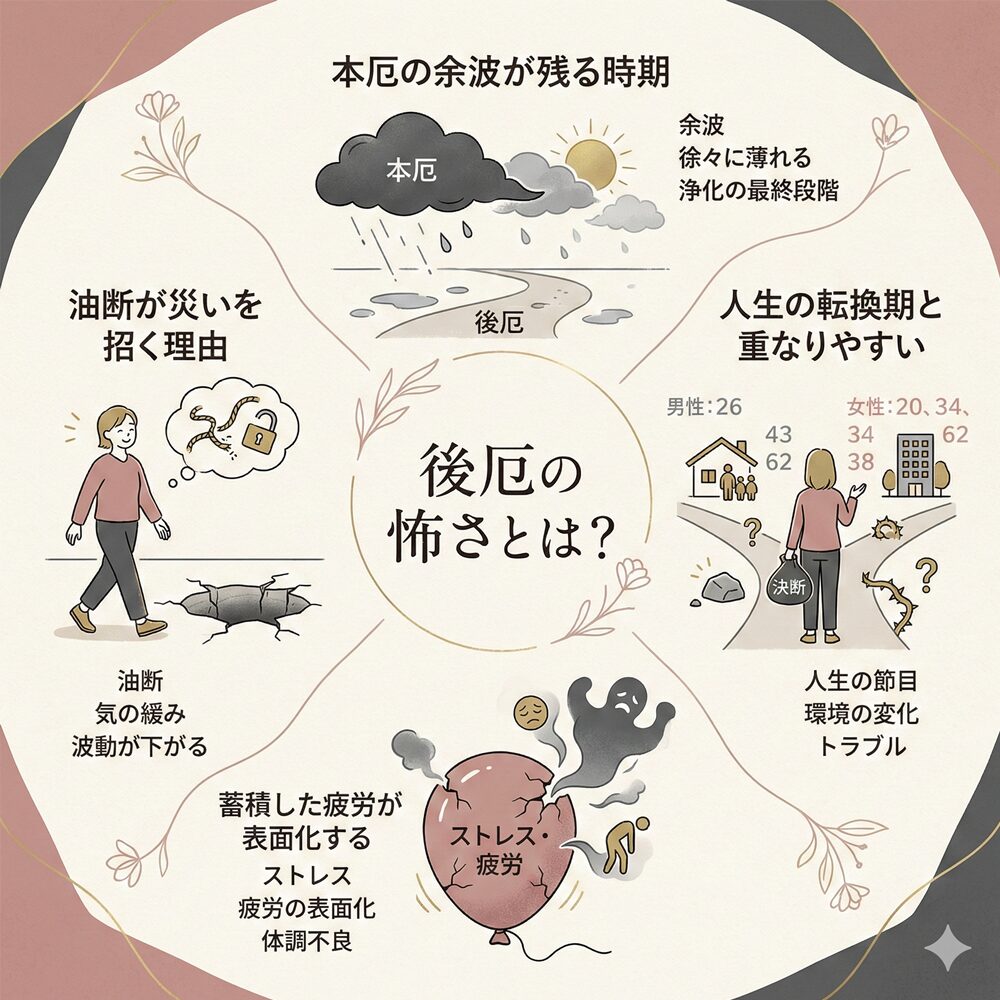 体調不良や精神的な不調として現れやすく、これが後厄の怖さにつながっています。溜まっていたものが最後に出てくるイメージです。