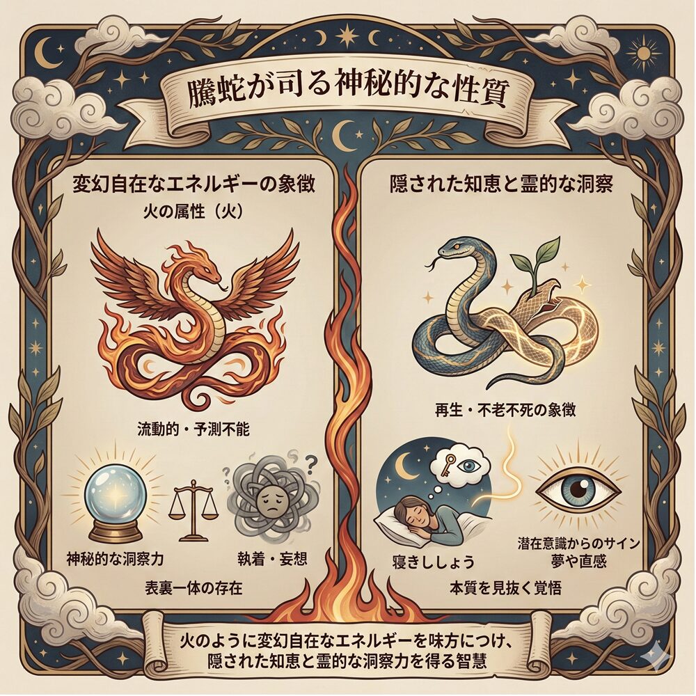 騰蛇は十二天将や八神の一つであり、五行では「火」の属性を持つとされています。燃え盛る火が形を一定に保たないように、騰蛇のエネルギーも極めて流動的で、予測不能な変化をもたらすのが特徴です。神秘的な洞察力を与えてくれる一方で、執着や妄想といった形で心を乱すこともあり、占術においては「表裏一体」の非常に扱いが難しい存在として知られています。