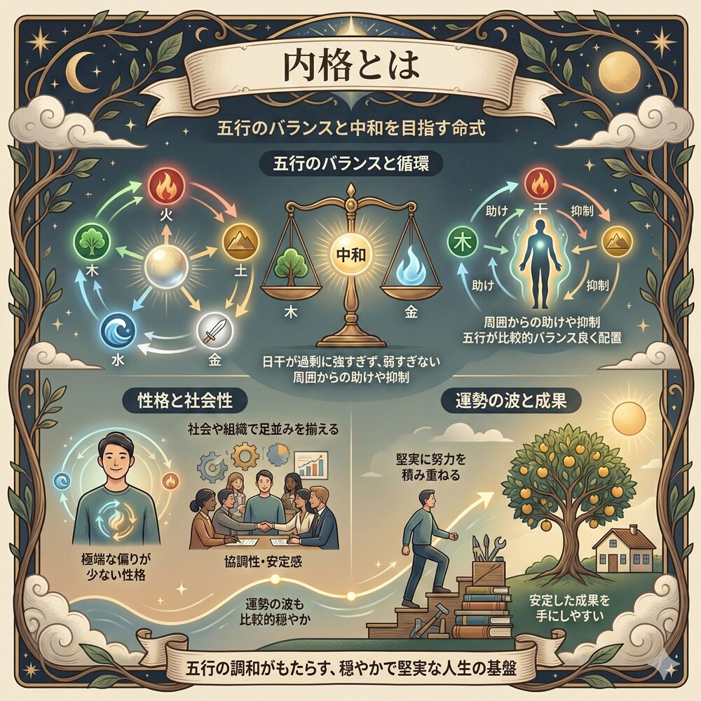内格(ないかく)は、四柱推命における「調和の美学」を体現した命式です。日干と五行が互いに支え合い、抑制し合うことで生まれるバランスは、あなたに社会的な安定と健全な精神をもたらしてくれます。