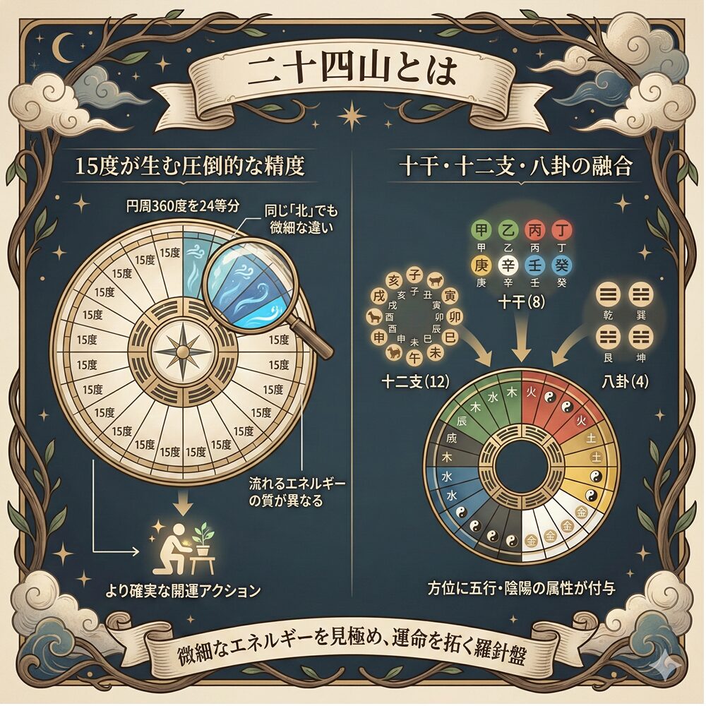 二十四山(にじゅうしざん)は、風水の解像度を極限まで高めた「開運の精密地図」です。360度を15度ずつに分けることで、私たちは自然界の複雑なエネルギーを正確に把握し、自分自身の生活に調和させることができます。