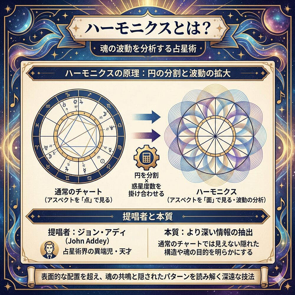 ハーモニクスは、占星術界の異端児とも天才とも称されるジョン・アディが提唱した技法です。円(360度)を特定の数で分割し、惑星の度数を掛け合わせることで、通常のチャートでは「点」としてしか見えなかったアスペクトを「面」として広げ、より深い情報を抽出します。